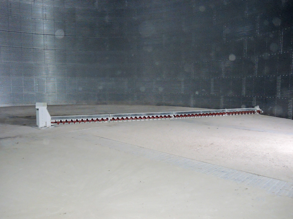 После основной выгрузки зерна из силоса при помощи выгрузных воронок, для разгрузки остатков зерна включают в работу зачистной шнек. Двигаясь по кругу, внутри силоса, шнек транспортирует зерно к центральной воронке. Вращение шнека осуществляется от мотор редуктора.