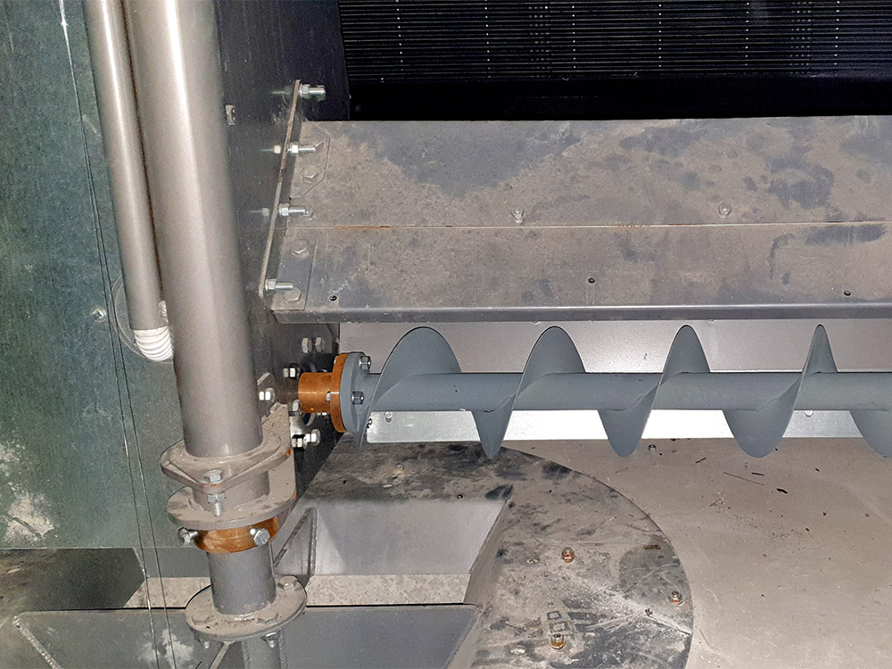 Зачистной шнек состоит из следующих частей: шнека, образованного спиральной поверхностью, приваренной к трубчатому валу, механизма движения шнека по кругу, механизма вращения самого шнека, защитного кожуха, корпуса. Зачистной шнек устанавливается в центральной части силоса.